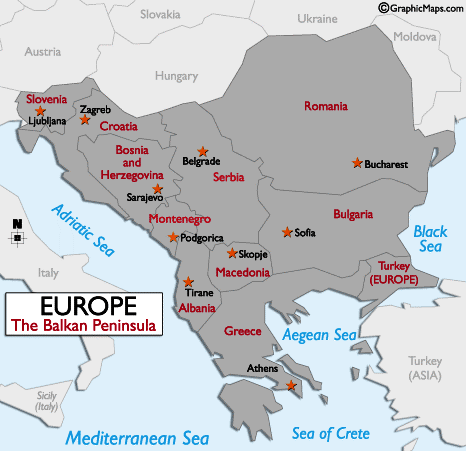 The Balkans: Political Boundaries(Kosovo isn’t included because it’s not widely recognized as a country but it is. At the southern end of Serbia.)