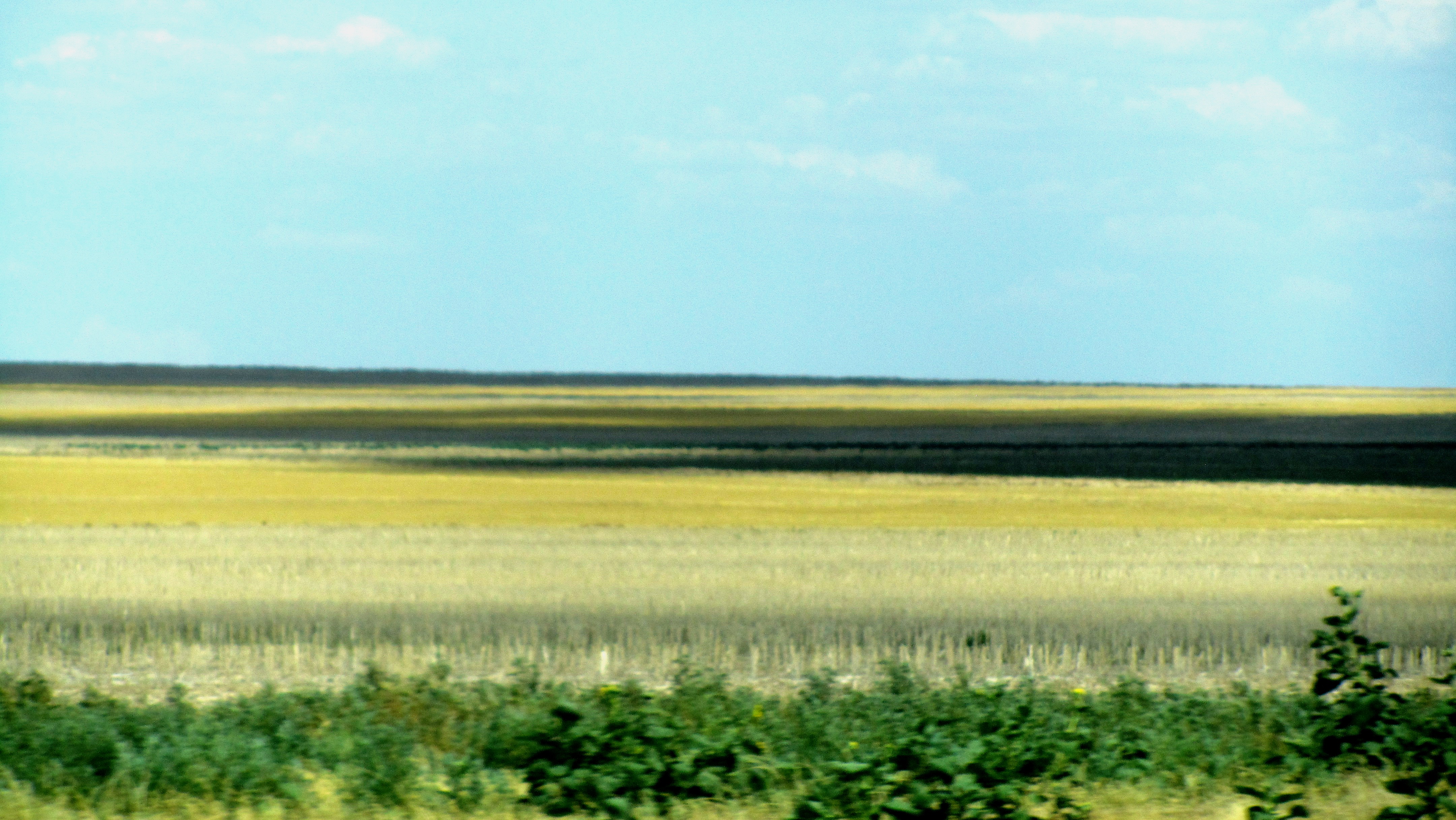 Abandoned houses and tiny towns by the dozens. Horses, cows, burning, bleak, highway, field, highway, stripes of horizon.